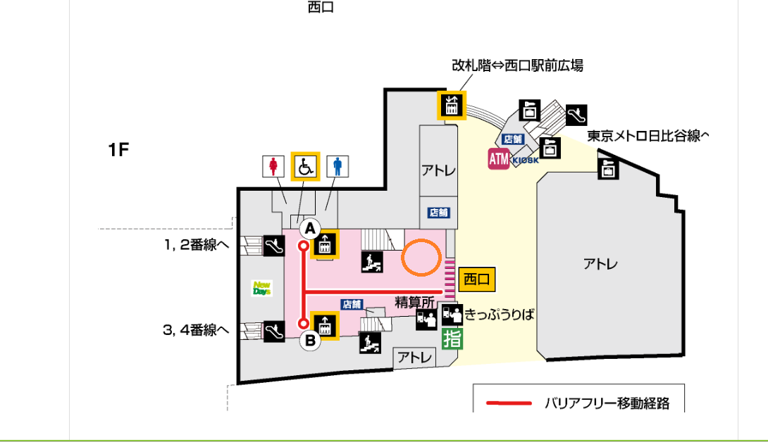 JR恵比寿駅(西口改札内) オレンジ丸の箇所です